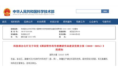 近日,科技部發(fā)布獲悉,科技部辦公廳關(guān)于印發(fā)《國家野外科學(xué)觀測研究站建設(shè)發(fā)展方案(2019-2025)》的通知(國科辦基〔2019〕55號,以下簡稱:“通知”)。