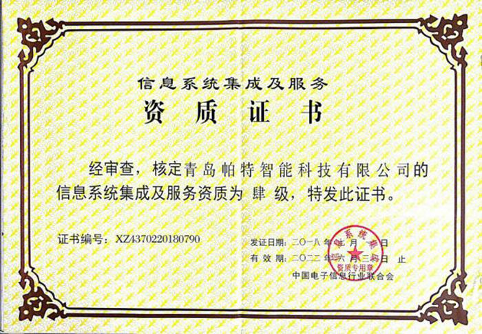 公司取得ISO9001認證與信息系統(tǒng)集成及服務(四級)認證,公司將系統(tǒng)集成、ISO9001和項目管理方法統(tǒng)一起來,將這些先進的現(xiàn)代管理思想和現(xiàn)代管理體系有機地融為一體,建立了一套企業(yè)管理的標準方法,并與企業(yè)的業(yè)務流程集成在一起,形成了帕特智能的運營管理和質量控制體系。