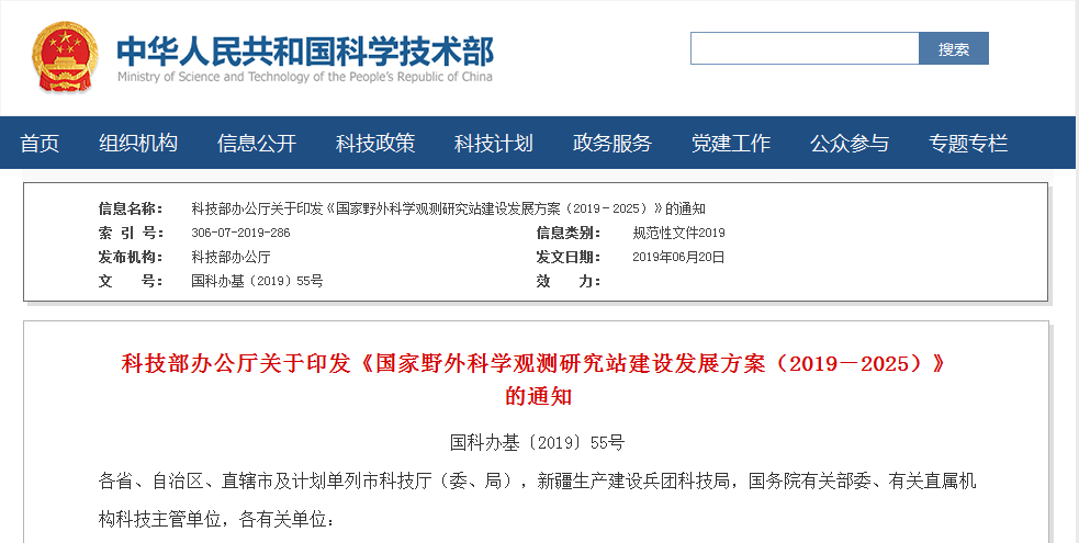 科技部辦公廳關(guān)于印發(fā)《國家野外科學觀測研究站建設(shè)發(fā)展方案(2019-2025)》的通知