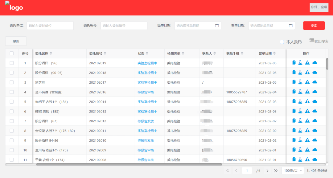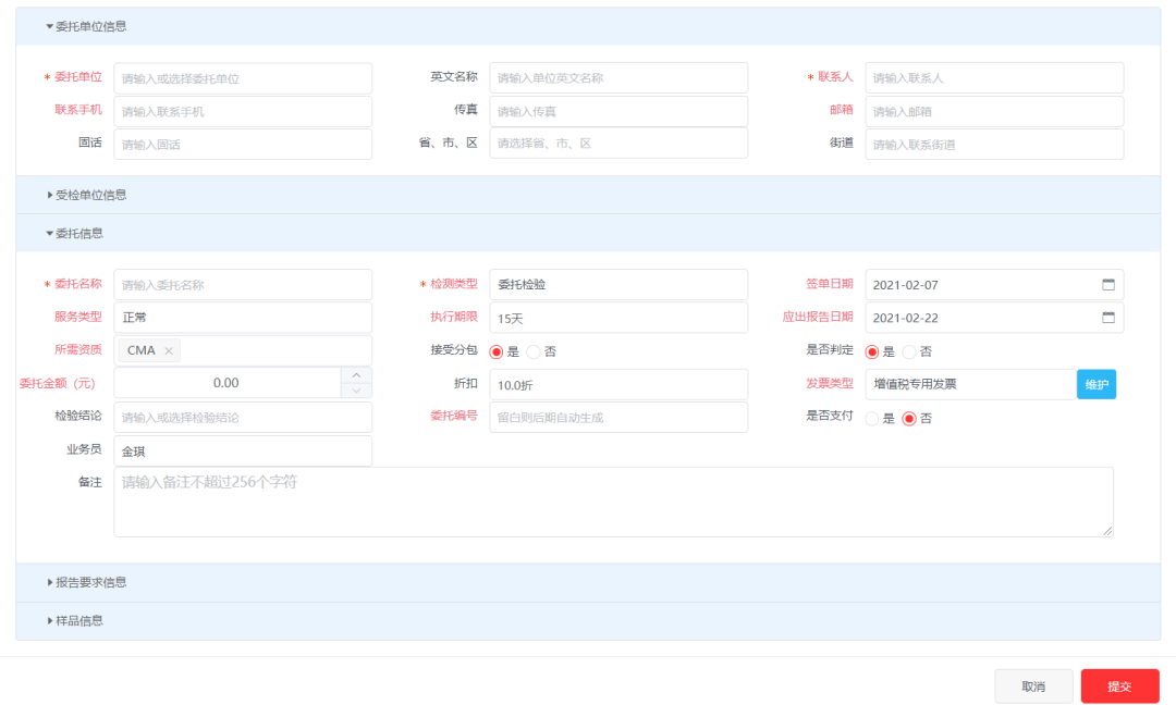 支持委托客戶遠(yuǎn)程線上報(bào)檢。委托客戶點(diǎn)擊“我要報(bào)檢”按鈕,可填寫委托信息,遠(yuǎn)程線上辦理樣品委托業(yè)務(wù)。同時(shí),委托客戶提交申請后,檢測機(jī)構(gòu)樣品受理員能及時(shí)看到該樣品委托信息,并在線針對(duì)客戶的委托進(jìn)行確認(rèn)。