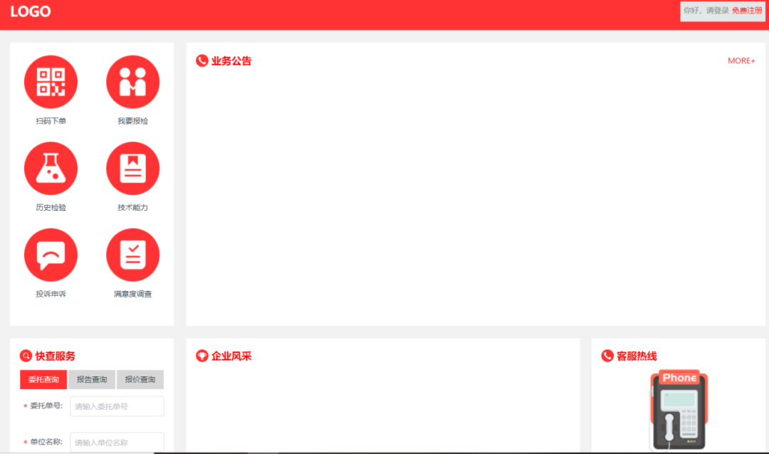 作為信息交互的窗口,實(shí)現(xiàn)了客戶與檢驗(yàn)檢測單位的實(shí)時(shí)信息交互和動(dòng)態(tài)溝通,首頁設(shè)計(jì)主要分為功能展示、業(yè)務(wù)公告、企業(yè)風(fēng)采、快查服務(wù)、客服熱線以及友情鏈接等板塊。